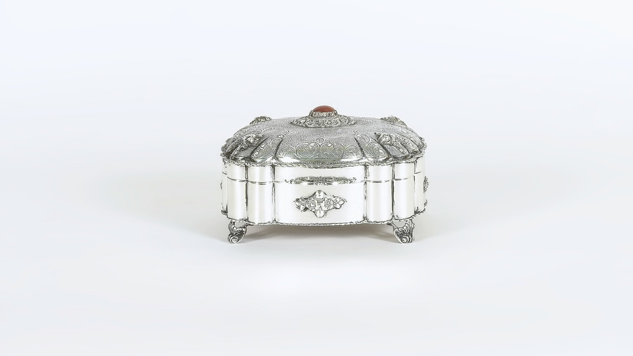 COFANETTO IN ARGENTO SATINATO prima metà del XX secolo di forma sagomata, coperchio con pietra dura cabochon incastonata, inciso con volute e girali gr 355 SILVER BOX, FIRST HALF OF 20TH CENTURY