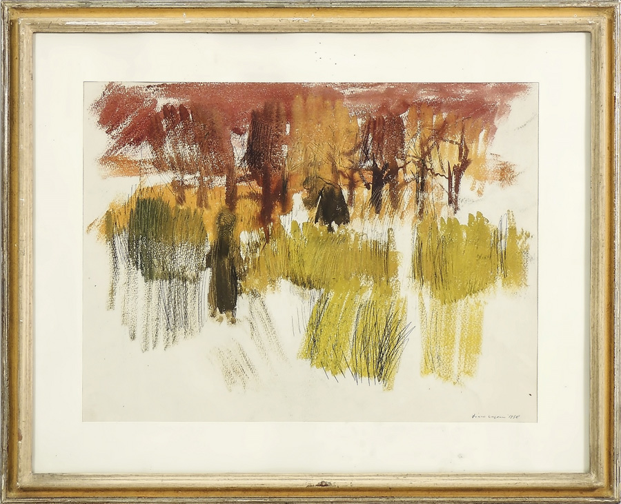DINO CAPONI (1920-2000) Veduta di bosco con personaggi 1958 tecnica mista su carta, firmato e datato, in cornice cm 37x49 PROVENIENZA: GALLERIA MICHELUCCI, FIRENZE FOREST VIEW WITH FIGURES, TECNICA MISTA SU CARTA