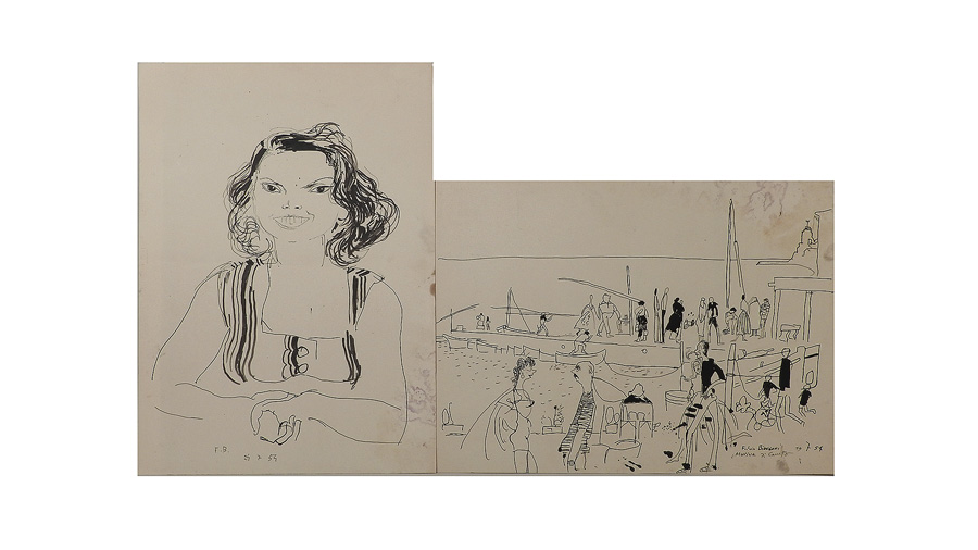 FULVIO BIANCHINI (1915-1996) Paesaggio marino con personaggi e Ritratto femminile 1954, due bozzetti a china su carta, uno firmato e l'altro siglato, datati, difetti cm 50,5x36 SEASCAPE WITH FIGURES AND FEMALE PORTRAIT, TWO SKETCHES