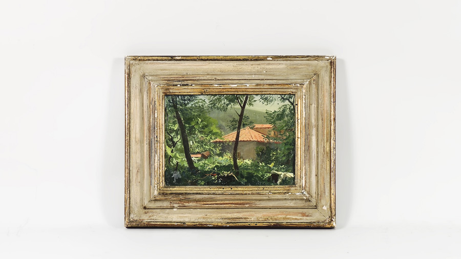 SILVESTRO PISTOLESI Paesaggio campestre con scorcio di casa 1983 olio su cartone telato, firmato e datato, al verso firmato e datato, in cornice cm 25x35 COUNTRY LANDSCAPE WITH A HOUSE VIEW, OIL ON CANVAS BOARD