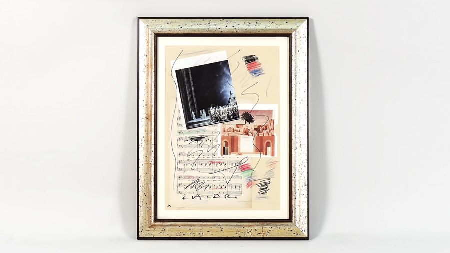 GIUSEPPE CHIARI (1926-2007) Composizione con spartiti musicali tecnica mista e collage, firmato, in cornice cm 50x34 Corredato di atentica dell'autore su fotografia COMPOSITION WITH SHEETS MUSIC, MIXED MEDIA AND COLLAGE, WITH AUTHOR'S AUTHENTICATION ON PHOTO
