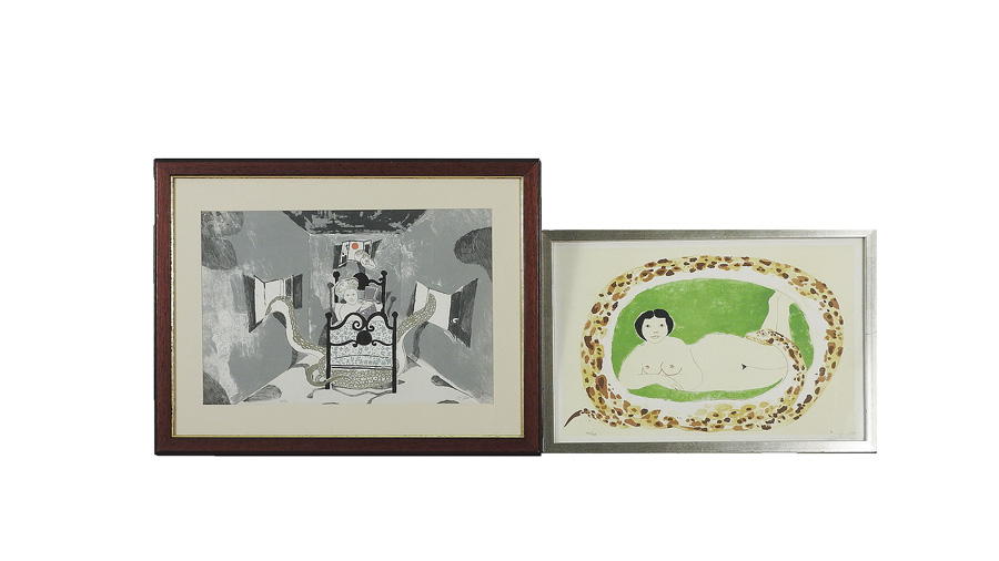 ANTONIO POSSENTI Veduta d'interno con figura e serpente e Nudo femminile con serpente due litografie, es 39/50, es 44/50, firmate, in cornice cm 33x49, cm 31x47 INTERIOR VIEW WITH A FIGURE AND SNAKE AND FEMALE NUDE WITH SNAKE, TWO LITHOGRAPHS