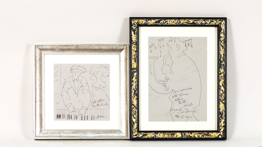 GIAMPAOLO TALANI Musicisti due bozzetti a penna su carta, firmati e dedicati, in cornice cm 19x18 MUSICIANS, TWO PEN SKETCHES ON PAPER