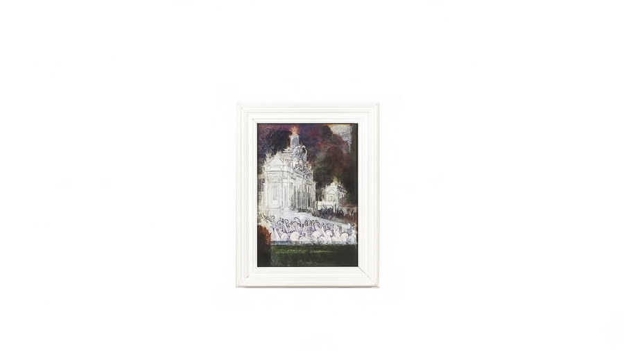 RAFFAELE DE ROSA Cattedrale e cavalieri tecnica mista su cartone telato, firmato, in cornice cm 36x24,5 CATHEDRAL AND KNIGHTS, MIXED MEDIA ON CANVAS BOARD