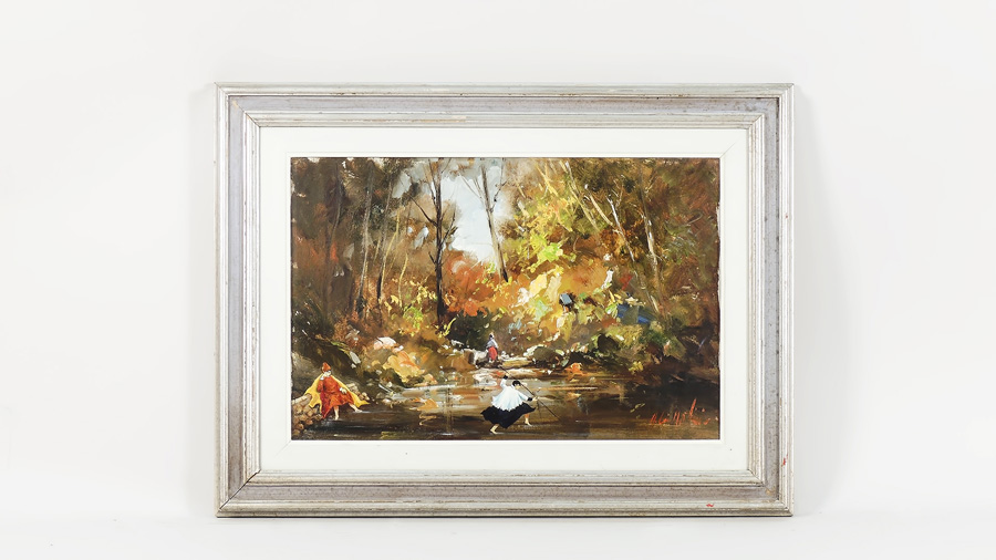 NORBETO MARTINI (1940-2007) Veduta di parco con figure religiose olio su tela, firmato, al verso firmato, in cornice cm 40x60 PARK VIEW WITH RELIGIOUS FIGURES, OIL ON CANVAS