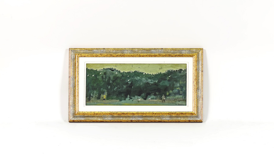 MARCELLO BOCCACCI (1914-1996) I due cacciatori di Barberino 1938 olio su cartoncino, firmato e datato, al verso firmato, datato e titolato, in cornice cm 20x45 Al verso reca timbro Galleria d'Arte Cavour, Firenze TWO TUSCAN HUNTERS, OIL ON CARDBOARD, WITH STAMP ON REVERSE