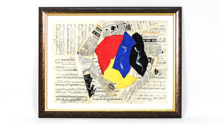 ARTURO CARMASSI (1925-2015) Composizione con spartiti musicali 1996 tecnica mista e collage, firmato e datato, in cornice cm 50x70 Corredato di autentica dell'autore su fotografia COMPOSITION WITH SHEETS MUSIC, MIXED MEDIA AND COLLAGE, WITH AUTHOR'S AUTHENTICATION ON PHOTO