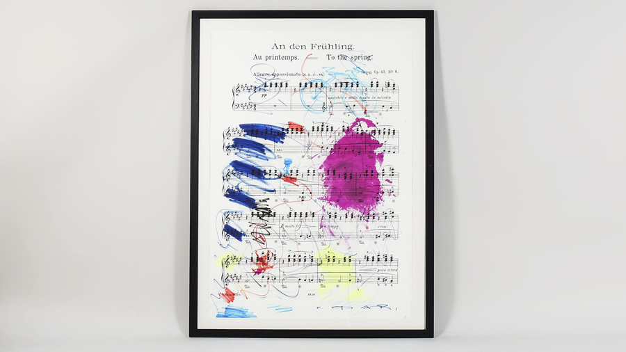 GIUSEPPE CHIARI (1926-2007) Composizione con spartito musicale tecnica mista su carta, firmato, in cornice cm 100x70 Corredato di autentica dell'autore su fotografia COMPOSITION WITH SHEET MUSIC, MIXED MEDIA ON PAPER, WITH AUTHOR'S AUTHENTICATION ON PHOTO