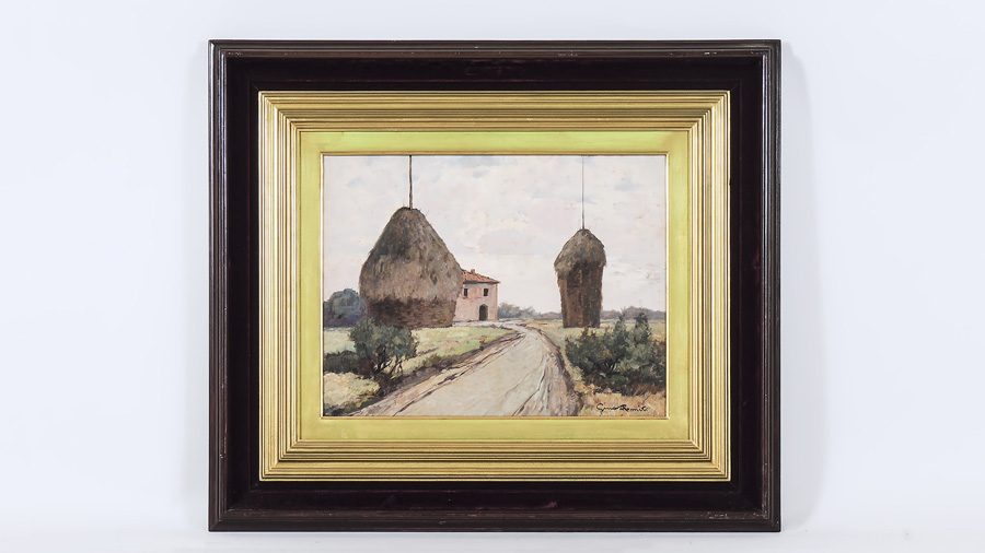 GINO ROMITI (1881-1967) Scorcio di strada di campagna con pagliai e casolare olio su tavoletta, firmato, in cornice cm 31,5x41 Coutry Landscape, oil on panel