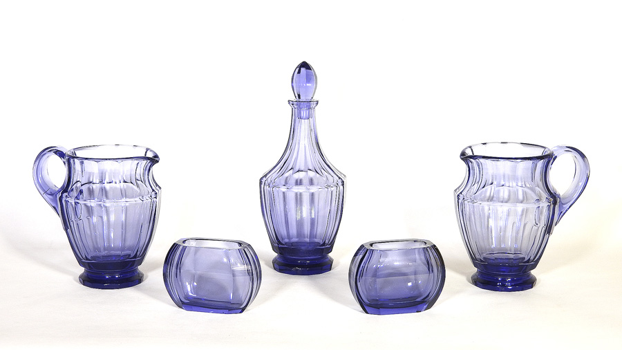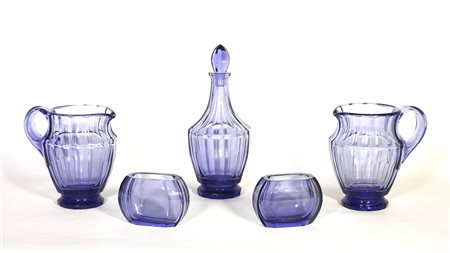 LOTTO DI OGGETTI IN VETRO VIOLA composto da una bottigli, una coppia di caraffe ed una coppia di piccoli vasi, lievi difetti (5) PURPLE GLASS LOT