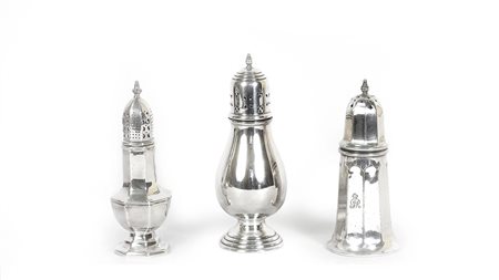 TRE SPARGIZUCCHERO IN SHEFFIELD tra cui uno inciso con monogramma coronato THREE SHEFFIELD SUGAR SHAKERS