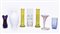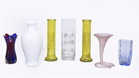 SETTE VASI IN VETRO tra cui uno molato con margherite, uno a balaustro in vetro lattimo e uno in vetro soffiato a tromba con base a spirale, difetti (7) SEVEN GLASS VASES