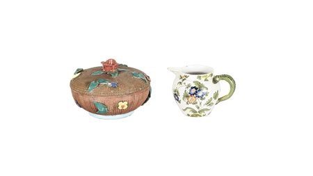 LOTTO un bricco in terracotta smaltata, Manifattura Ugo Zaccagnini e Figli, inizio del XX secolo, dipinto con fiori di tacchiolo, ed un porta bon bon con coperchio in terracotta, Manifattura Zaccagnini, Anni Trenta, decorato con fiori policromi a rilievo, interno smaltato nei toni del celeste, lievi difetti (2)