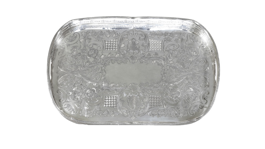 VASSOIO IN SHEFFIELD bordo a ringhiera, fondo sbalzato e cesellato con motivi floreali e vegetali SHEFFIELD TRAY