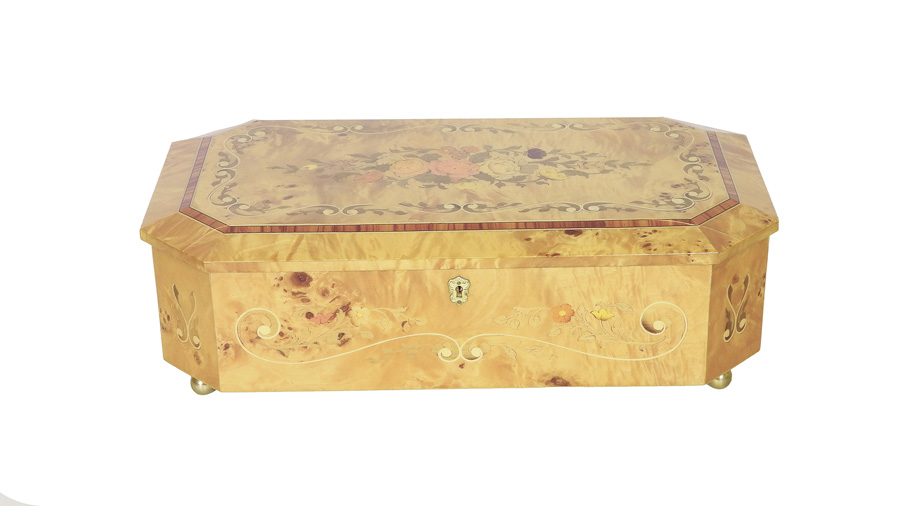 COFANETTO PORTAGIOIE IMPIALLIACCIATO IN RADICA intarsiato con filettature e dipinto con motivi floreali e volute, con carillon, lievi difetti h cm 14x47x26,5 BURR VENEERED JEWELRY MUSIC BOX
