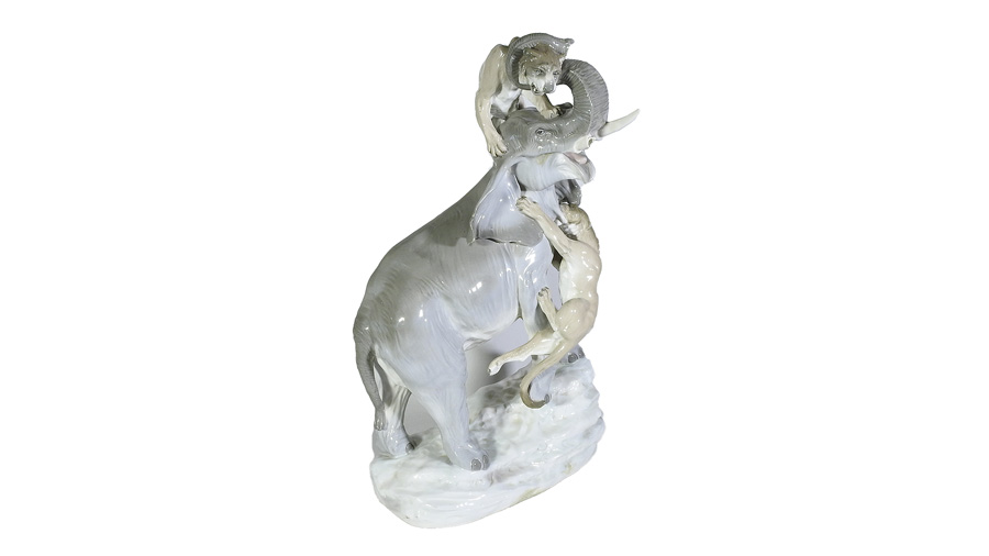 GRANDE GRUPPO IN PORCELLANA POLICROMA Amphora raffigurante un elefante assalito da due tigri, difetti h cm 65 Marchio impresso sotto la base con numero di serie 8263 3 LARGE PAINTED PORCELAIN FIGURAL GROUP, AMPHORA
