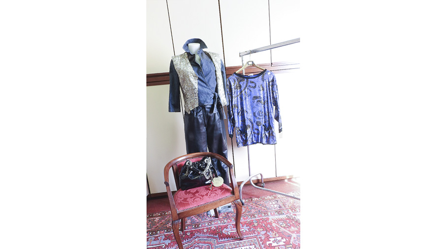 LOTO VINTAGE bluse, Carla Radaelli, fantasia animalier nei tonidel bluette, nero e oro, tg M circa; paio di pantaloni cinque tasche in pelle nera, John F, Firenze, tg M circa; camicia in denim, Armani Jeans, tg 42; gilet in paillettes dorate e borsetta a spalla in vernice eco nera Pinko, alcuni difetti (5)