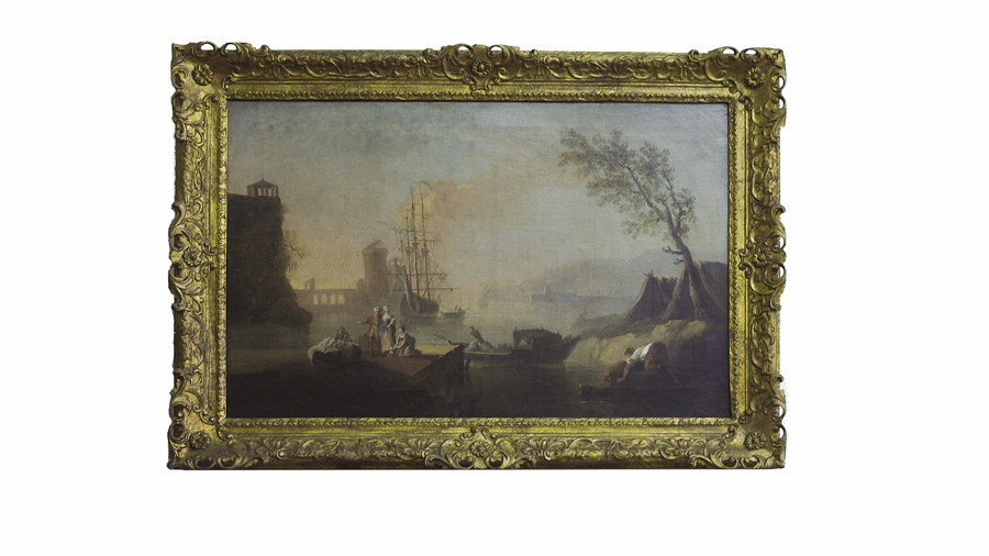 SCUOLA FRANCESE DEL XIX SECOLO L'attracco del galeone olio su tela, in cornice cm 63,5x95,5 FRENCH SCHOLL OF 19TH CENTURY, THE DOCKING OF THE GALLEON, OIL ON CANVAS