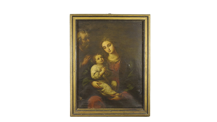 SCUOLA NAPOLETANA DEL XVIII SECOLO Sacra Famiglia olio su tela, in cornice coeva, difetti cm 100x79,5 NEAPOLITAN SCHOOL OF 18TH CENTURY, THE HOLY FAMILY, OIL ON CANVAS