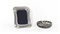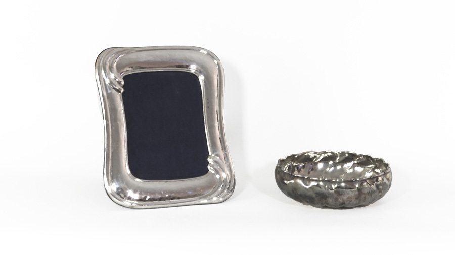 LOTTO una coppa centrotavola in metallo argentato ed una cornice portaritratti rivestita in argento (2)