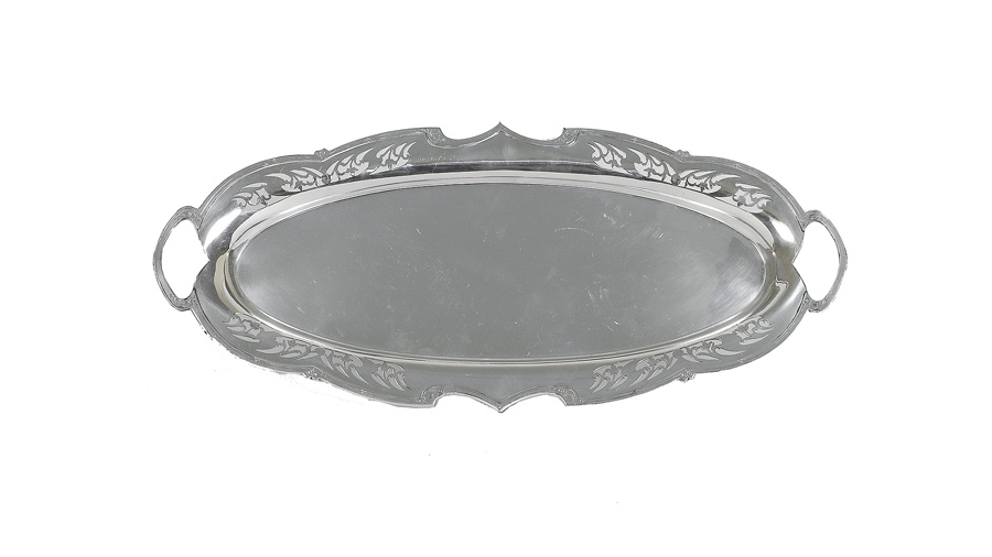 VASSOIO BIANSATO OVALE IN SHEFFIELD Inghilterra, James Deakin&Sons bordo sagomato e traforato con motivi floreali di gusto liberty OVAL SHEFFIELD TRAY, ENGLAND, JAMES DEAKIN&SONS