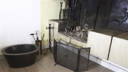 LOTTO DI OGGETTI DA CAMINO una coppia di alari in ferro battuto, alcuni attrezzi ed un grande bacile porta legna in metallo laccato FIREPLACE TOOLS