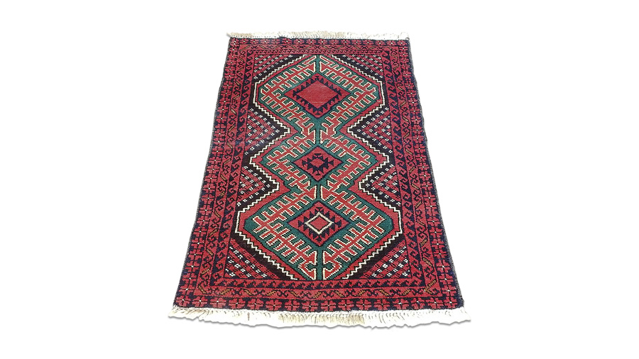 TAPPETO PERSIANO BELUCISTAN fondo bordeaux, campo con motivi geometrici stilizzati nei toni del verde, blu e avorio cm 145x86 PERSIAN BELUCISTAN CARPET