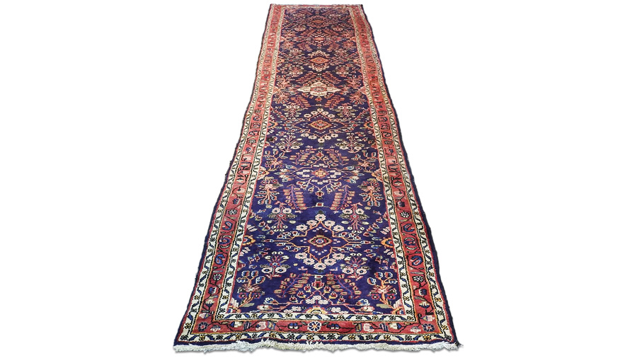 TAPPETO GALLERIA PERSIANO fondo blu, campo con motivi floreali nei toni del rosso, verde e arancio cm 530x107 circa PERSIAN LONG CARPET