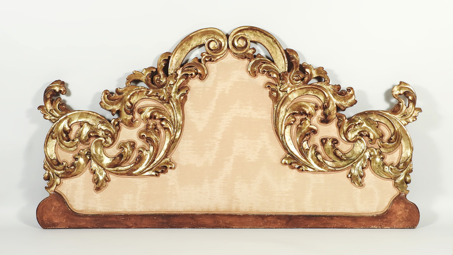 TESTIERA PER LETTO MATRIMONIALE realizzata con antichi frammenti in legno intagliato e dorato applicati a pannello imbottito e rivestito in moiré giallo oro cm 93x172 GILTWOOD HEADBOARD