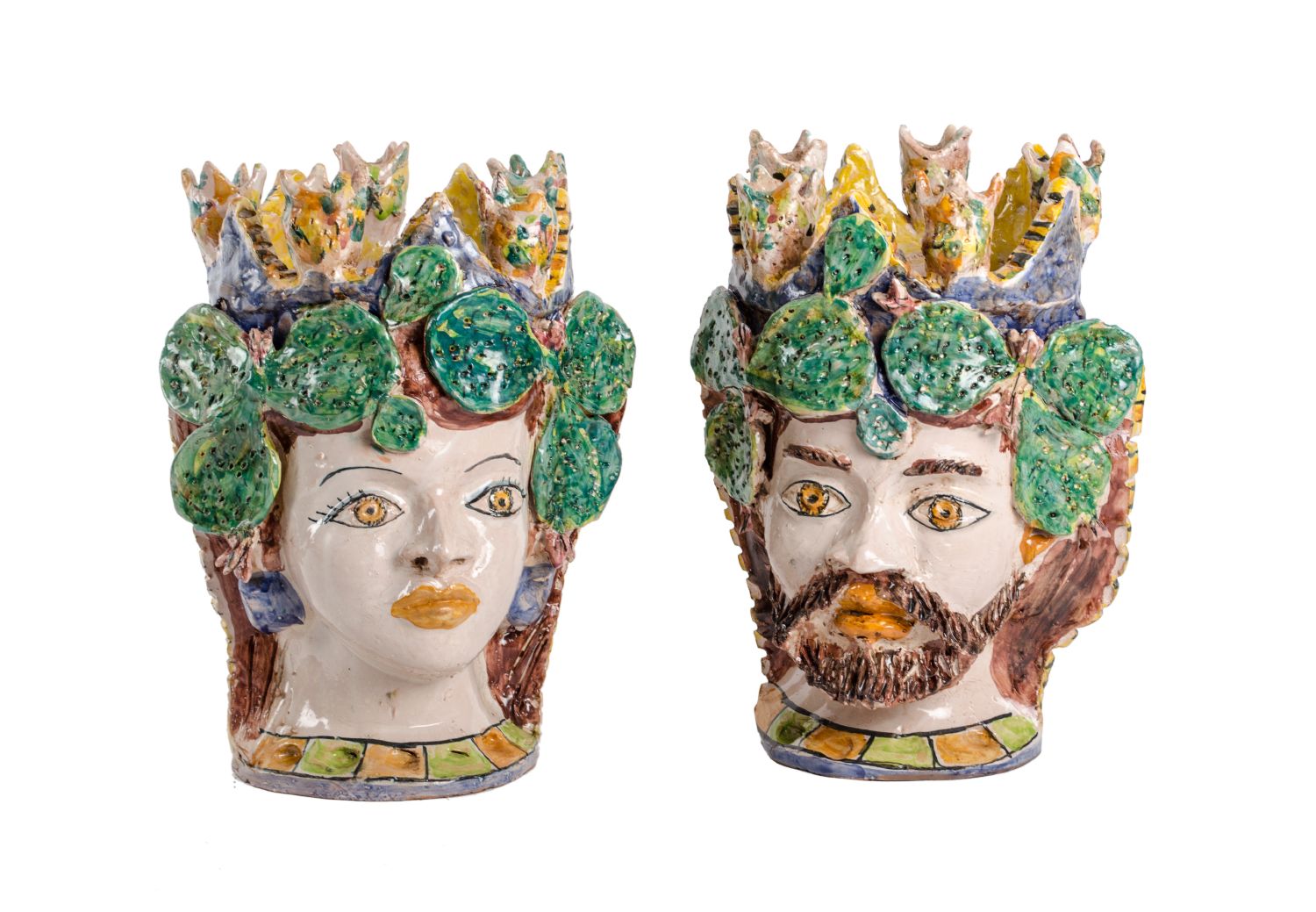 COPPIA VASI a cratere in terracotta smaltata e dipinta a mano lavorati raffiguranti "volti" e "pale di fichi d'india". Caltagirone meta' '900 Misure: h cm 37