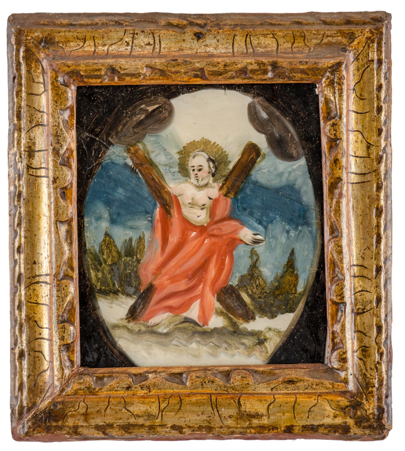 PITTURA su vetro raffigurante "Sant'Andrea Apostolo" entro cornice coeva in legno dorato ad argento a mecca (file'). Italia XVIII secolo Misure: cm 21,5 x 24,5