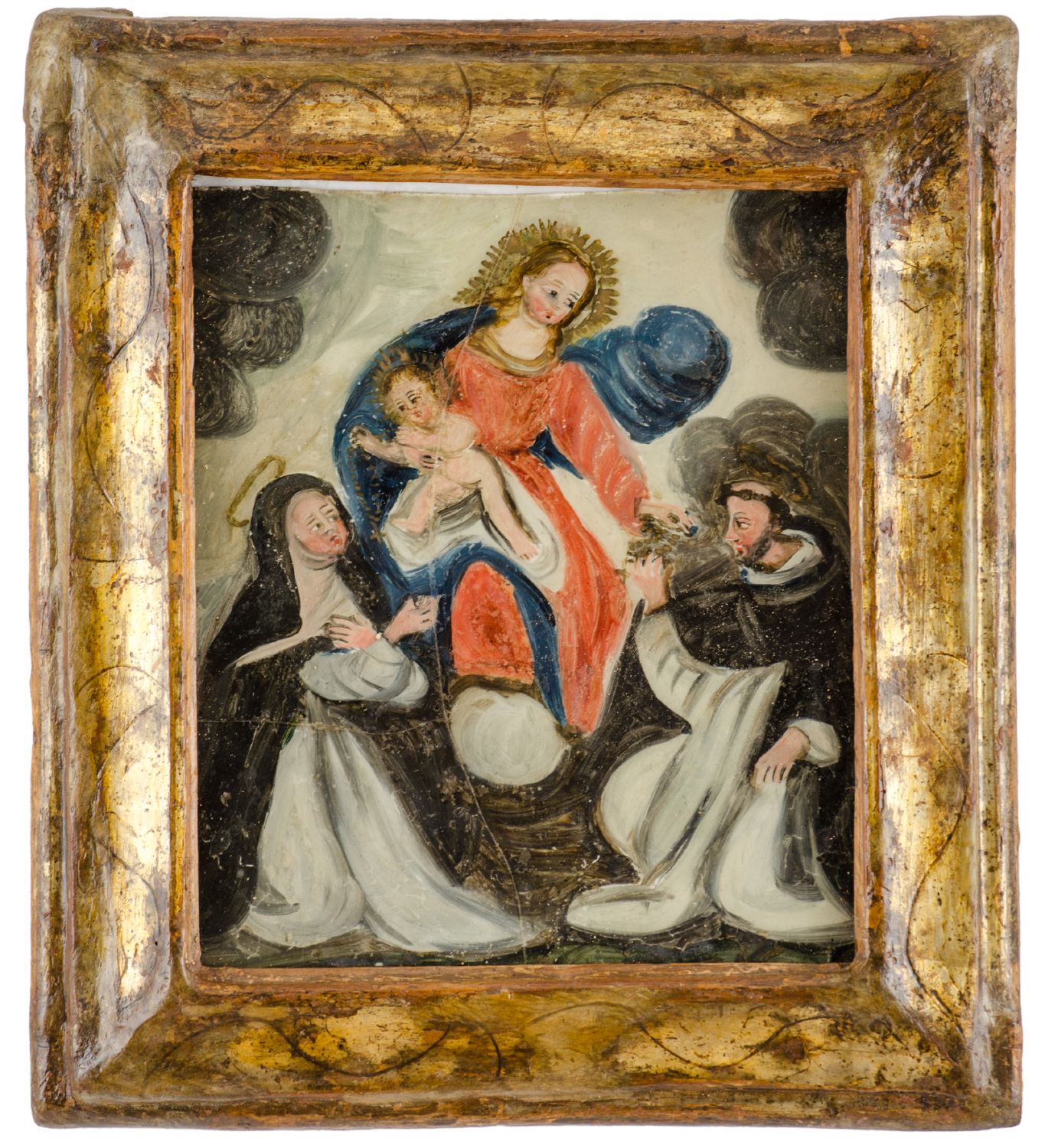 PITTURA su vetro "Vergine del rosario con San Domenico e Santa Caterina" entro cornice dorata ad argento a mecca (file'). Italia XVIII secolo Misure: cm 20 x 24