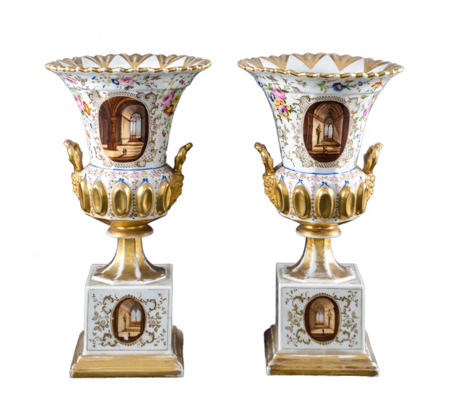 COPPIA VASI Impero in porcellana bianca lumeggiata in oro e decorata a motivo floreale e fogliaceo, medaglione raffigurante "interno di cattedrale". Francia primi '800 Misure: h cm 30