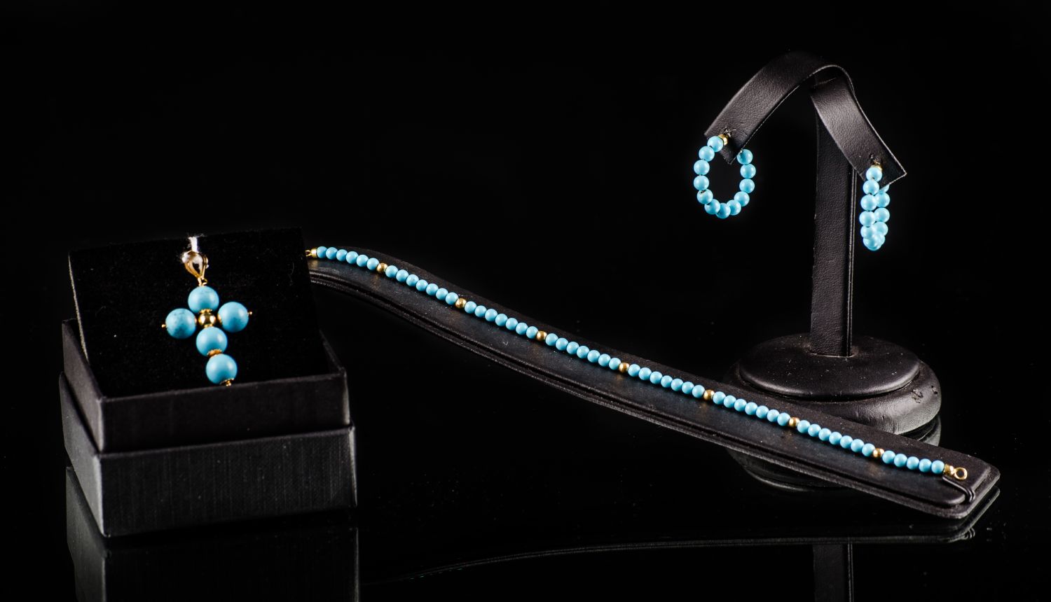 LOTTO composto da PENDENTE a croce in turchese ed oro giallo 18 kt., BRACCIALETTO e ORECCHINI in microsfere di turchese ed oro giallo 18 Kt.