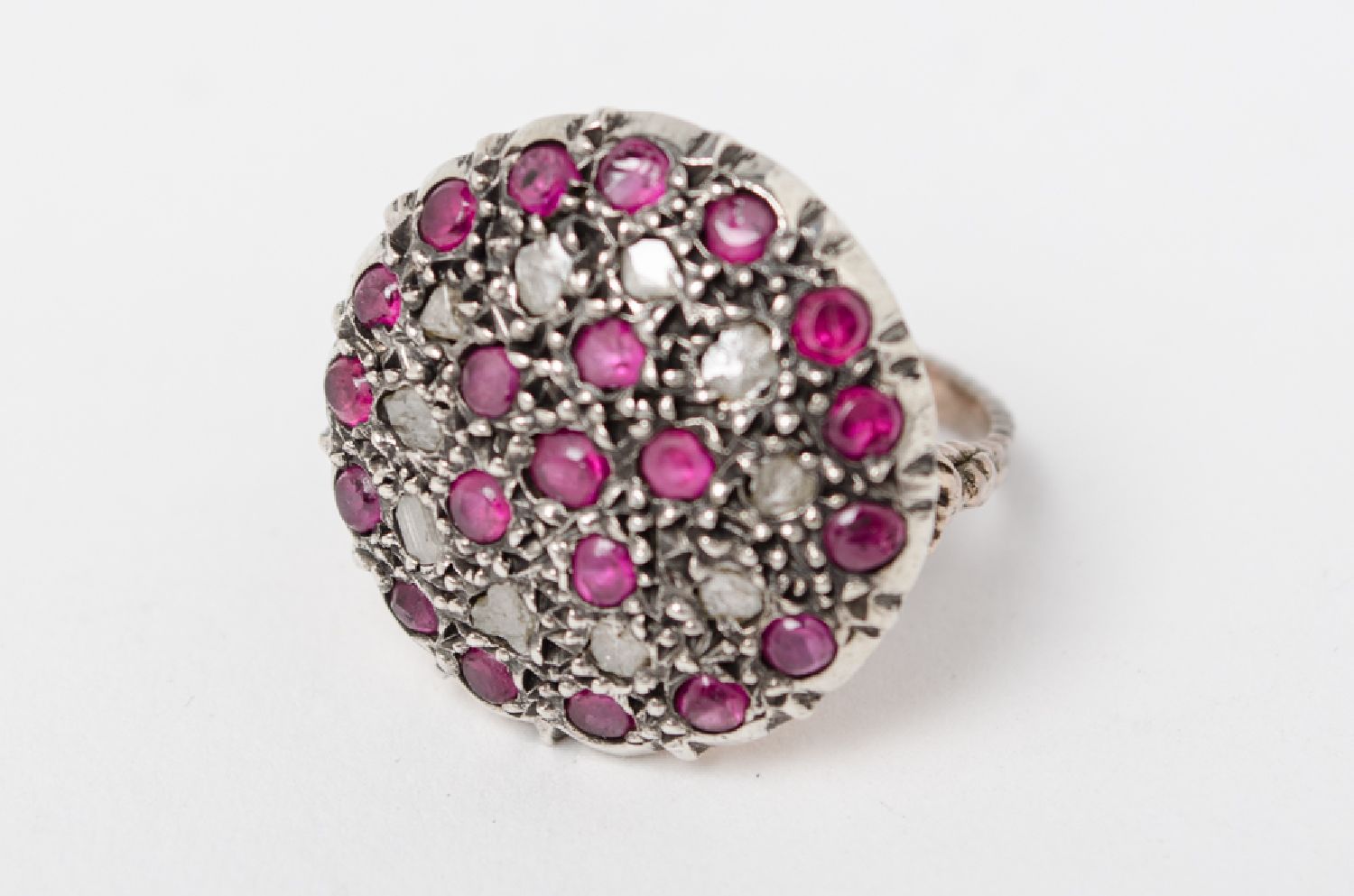 ANELLO a toppa in oro basso titolo con diamanti, rose corone' e rubini.