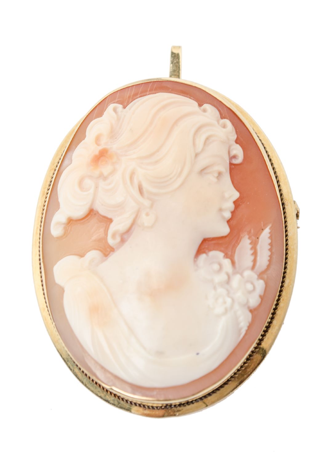 PENDENTE/SPILLA con cammeo raffigurante "profilo femminile" con cornicetta in oro giallo 18 Kt.