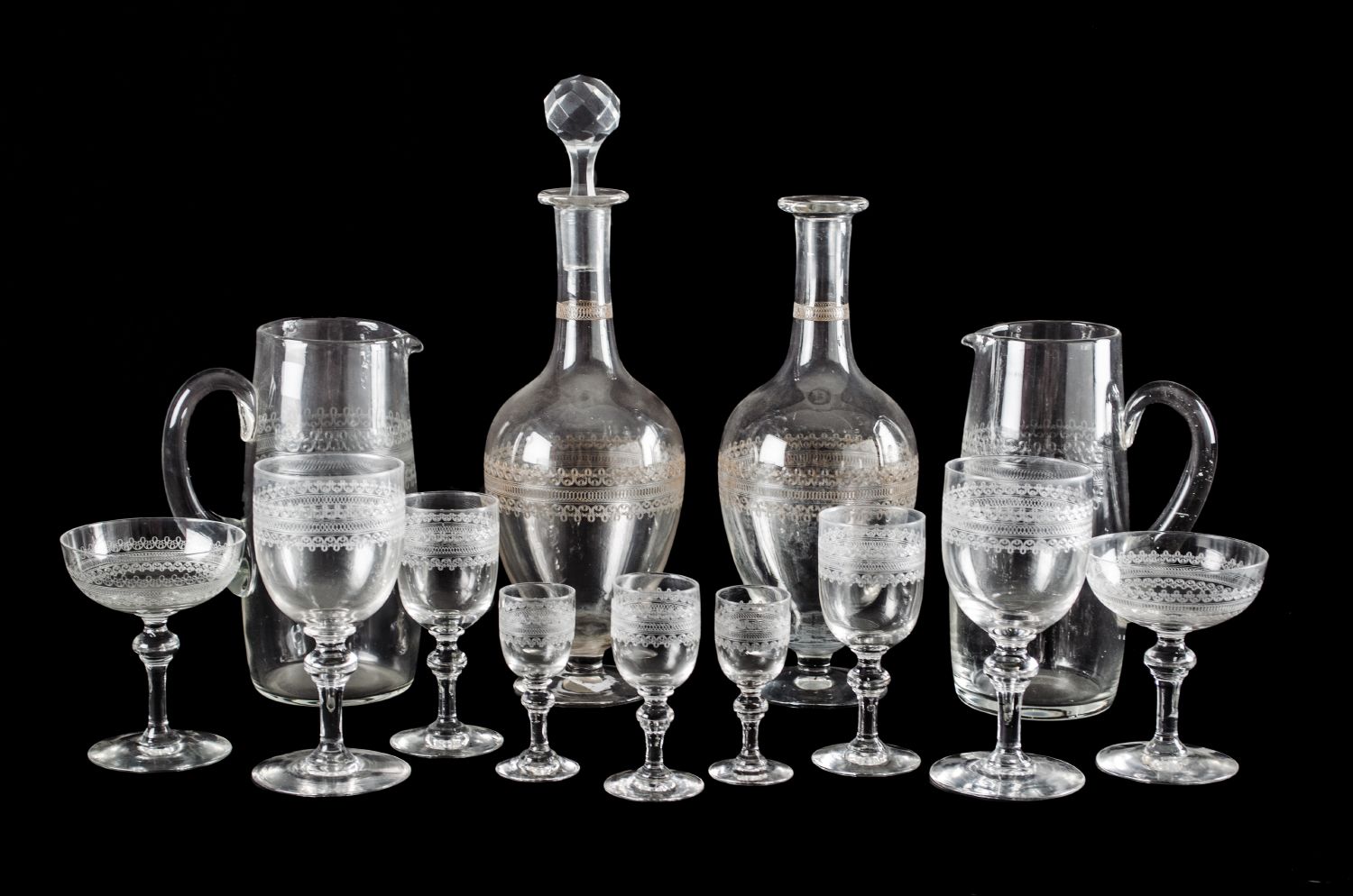 SERVIZIO BICCHIERI in cristallo Baccarat composto da 4 BROCCHE, 2 BOTTIGLIE (un tappo mancante), 8 BICCHIERI per acqua, 8 BICCHIERI piccoli per liquore, 8 BICCHIERI medi per liquore, 8 BICCHIERI grandi per liquore e da 8 COPPE da Champagne. Meta' '800 Misure: varie