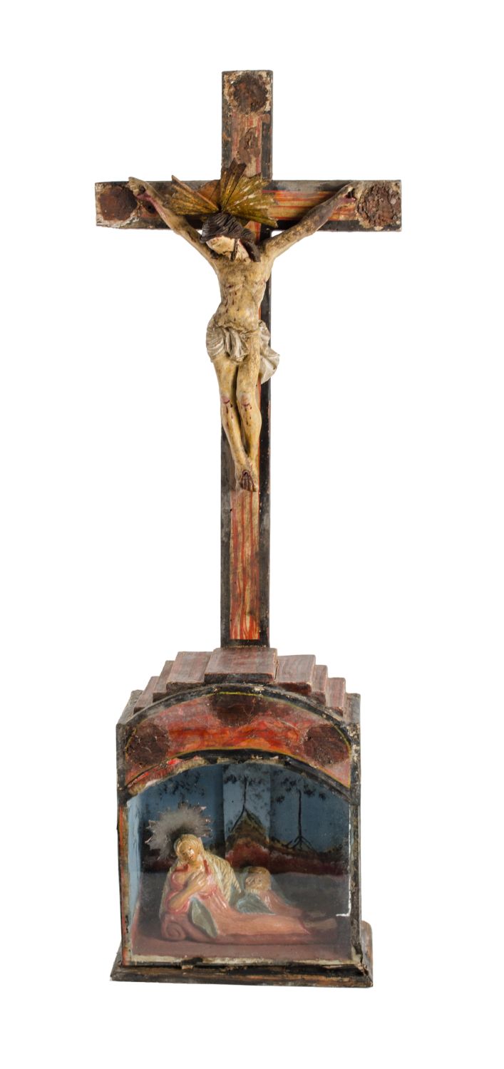 CROCIFISSO da tavolo in legno laccato con teca alla base contenente scultura in terracotta raffigurante "Santa" (Cristo h cm 30). Spagna XVIII secolo Misure: h cm 76,5