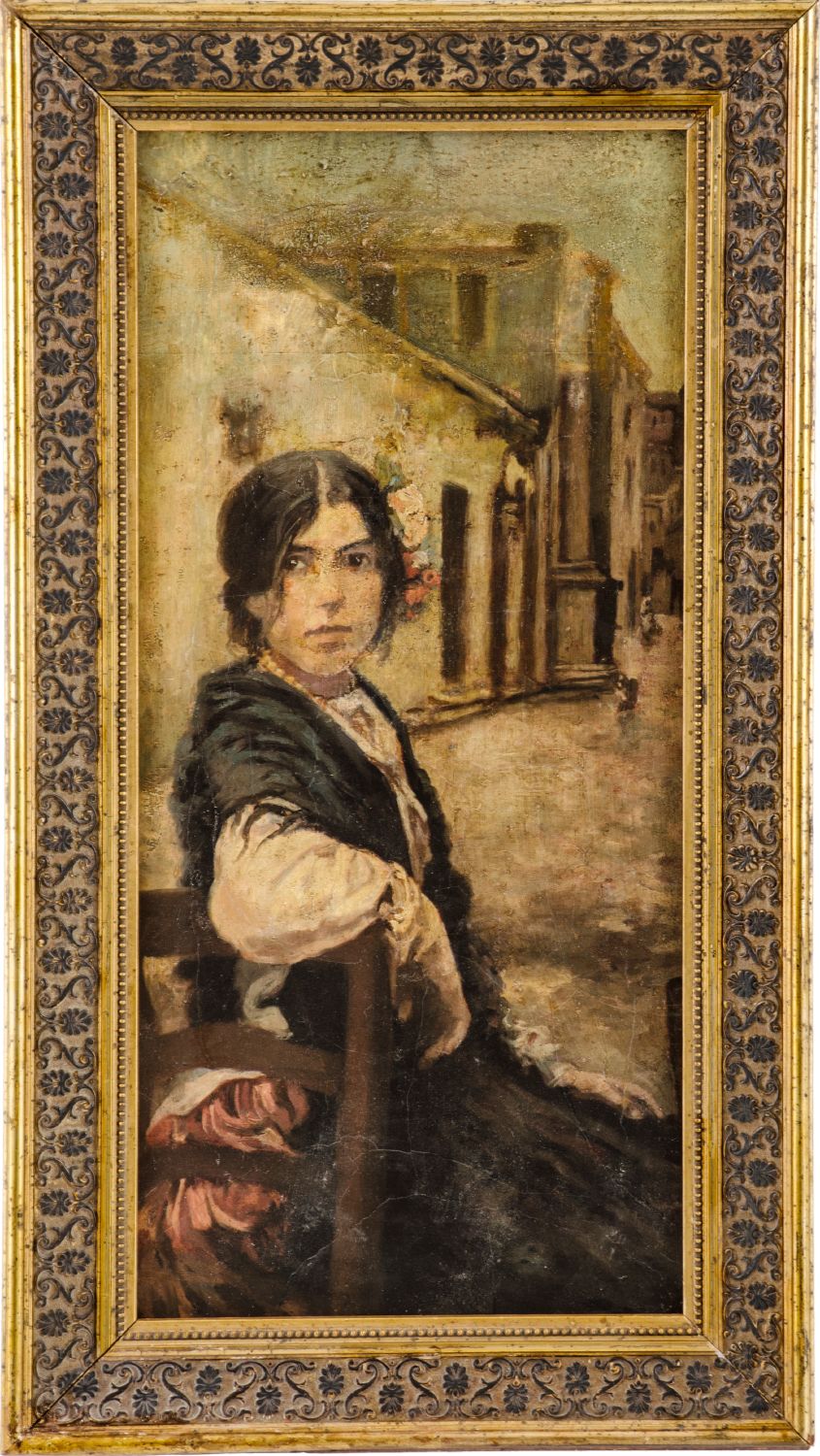 PITTORE NAPOLETANO OLIO su tela "popolana seduta in un vicolo". XIX secolo...