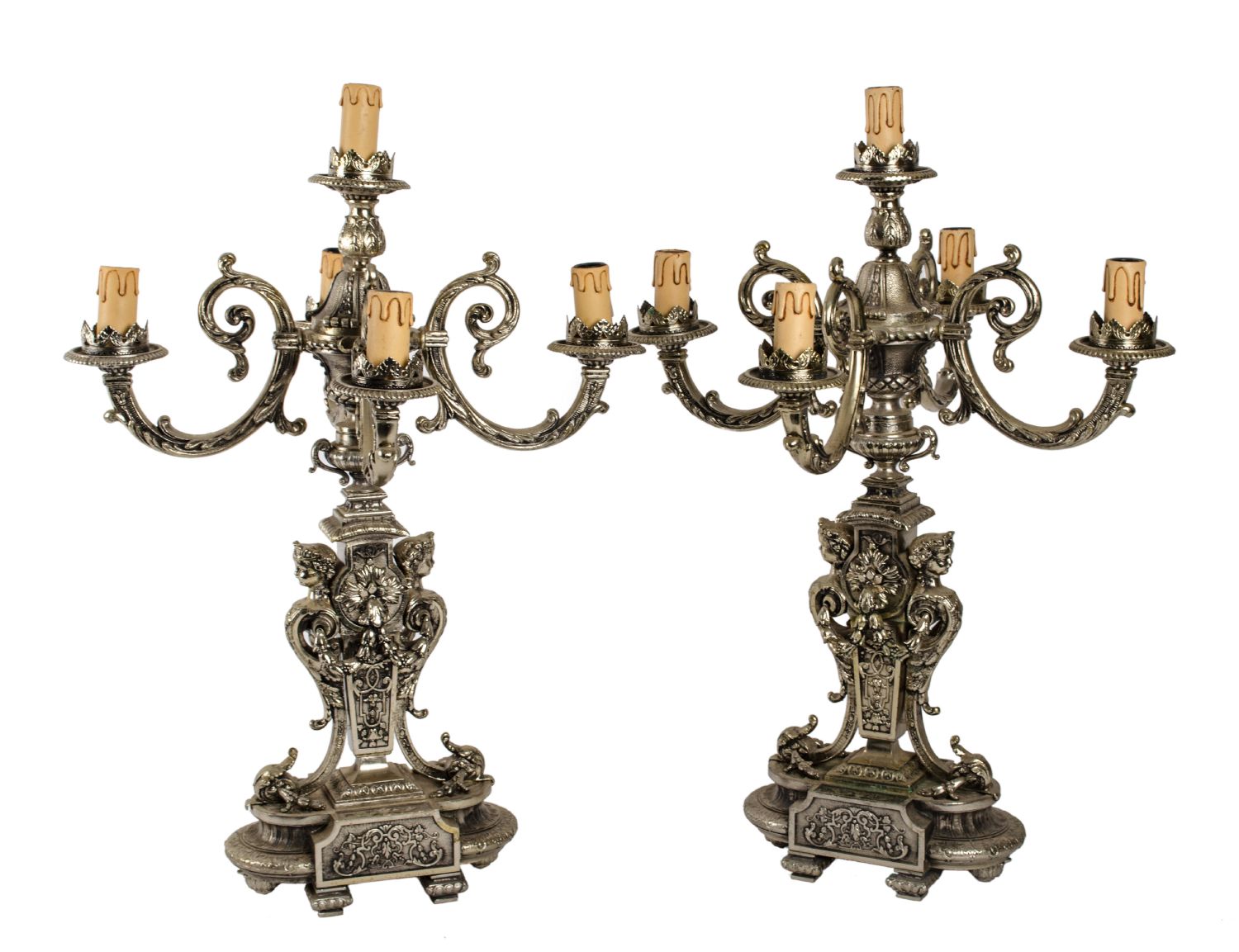 COPPIA CANDELABRI a cinque luci in metallo argentato riccamente lavorato....