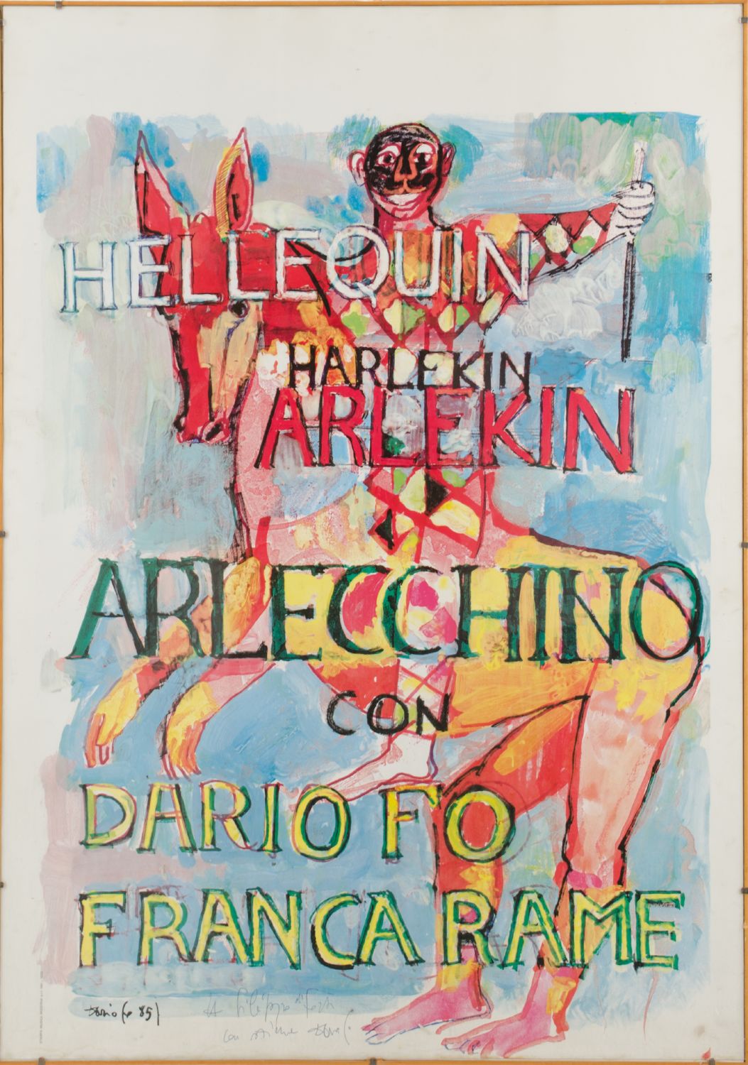 STAMPA manifesto dello spettacolo "Arlecchino con Dario Fo e Franca Rae", firmato in basso a sinistra Dario Fo. Misure: cm 70 x 100