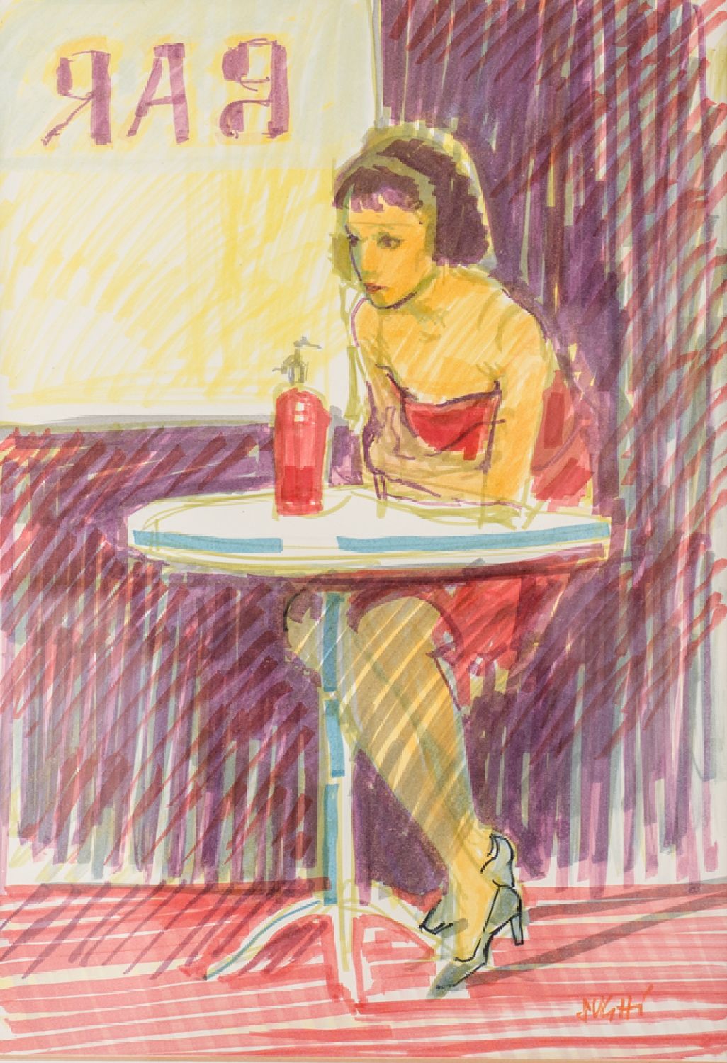 ALBERTO SUGHI (Cesena 1928 - Bologna 2012) INCHIOSTRI colorati su cartoncino "donna al bar", firmato in basso a destra (con autentica dell'artista su foto N. 634). Misure: cm 34 x 49