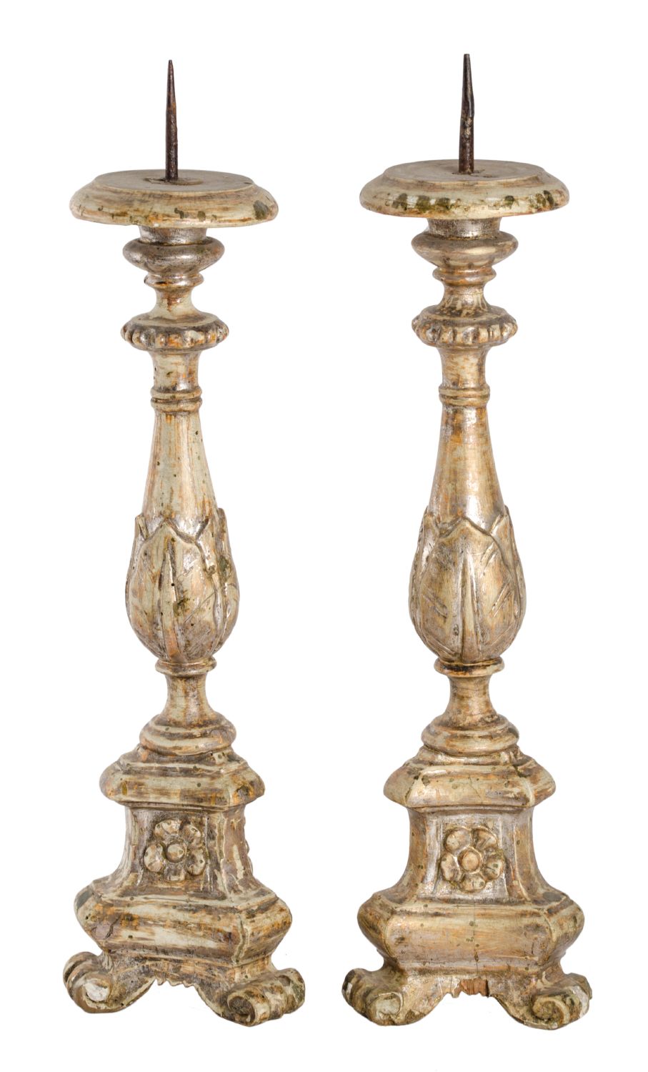 COPPIA TORCERI in legno argentato. Italia XIX secolo Misure: h cm 53