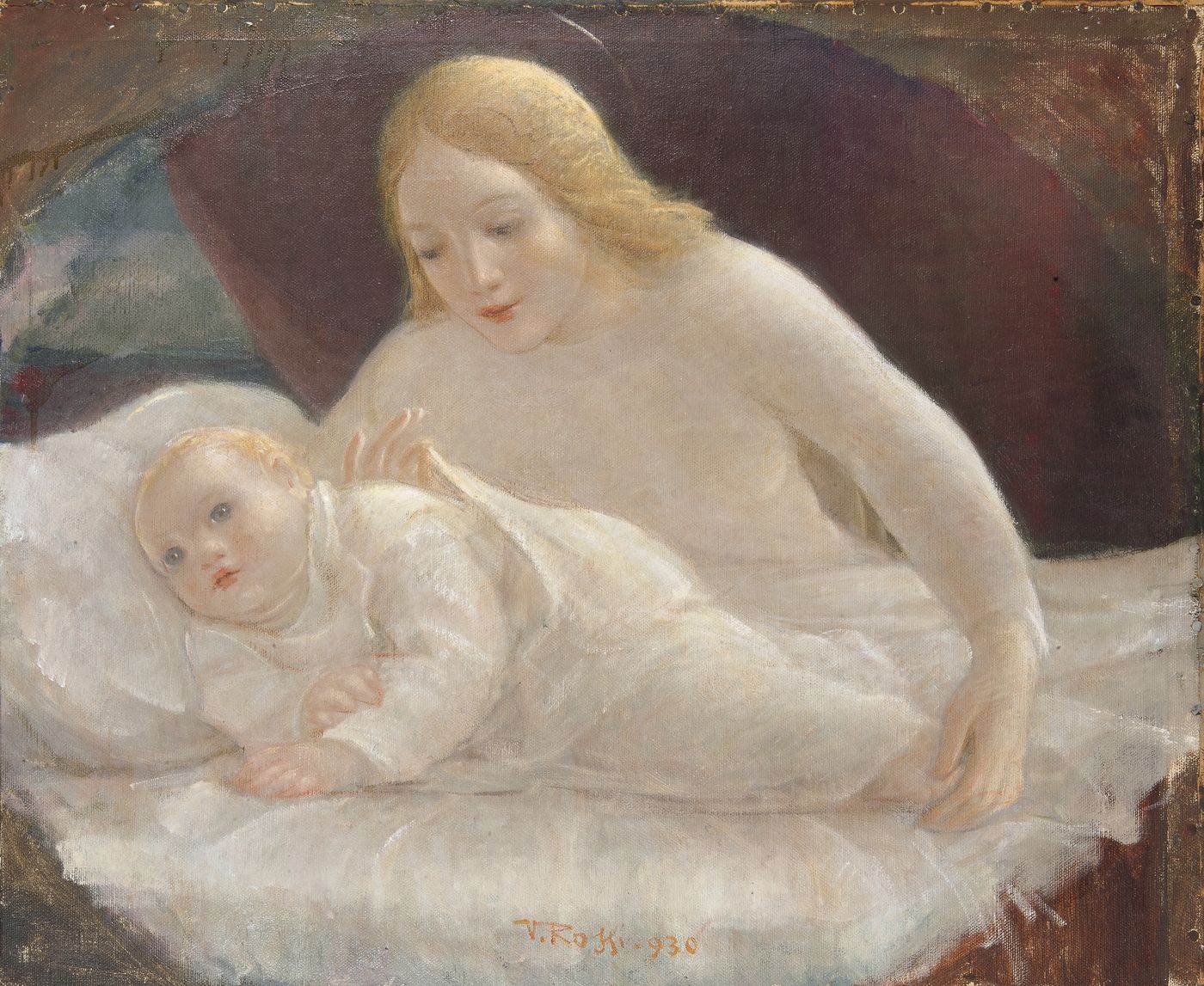 GIOVANNI ROSSI detto VANNI (Ponte San Pietro (Bergamo) 1894- Milano 1973) - "Madonna con Bambino" 1930, 60x74 olio su tela. Opera firmata e datata in basso al centro. L'opera, di formato rettangolare, è inserita all'interno di una cornice ovale