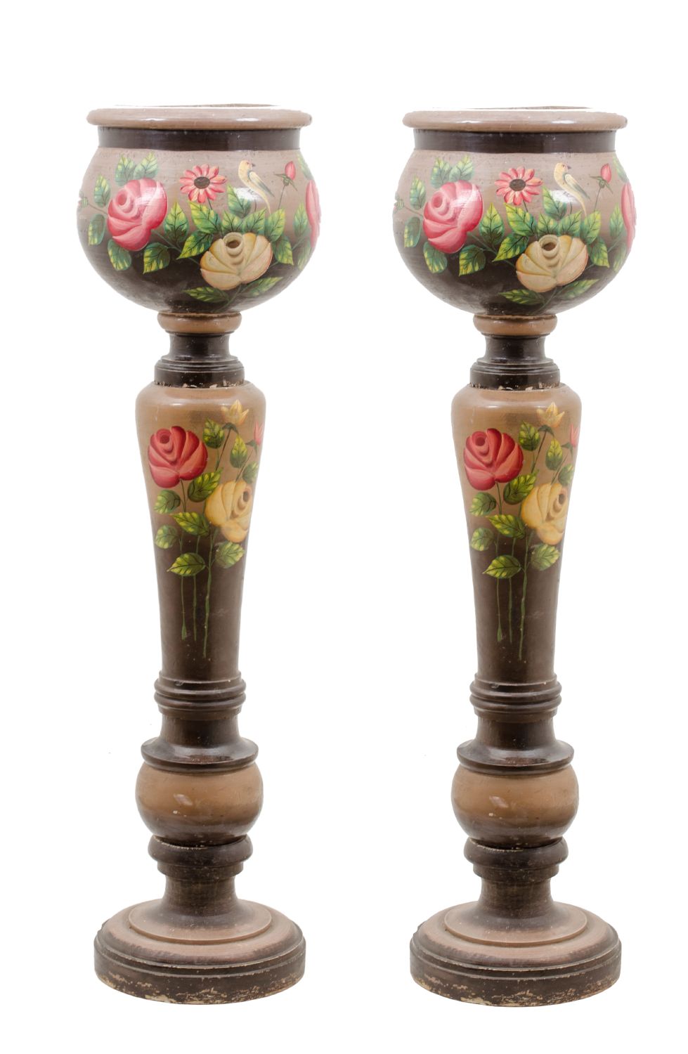 COPPIA CACHEPOT con colonne in pietra siracusana decorata e dipinta a mano. Sicilia periodo Liberty primi '900 Misure: diametro cm 36 x h 162