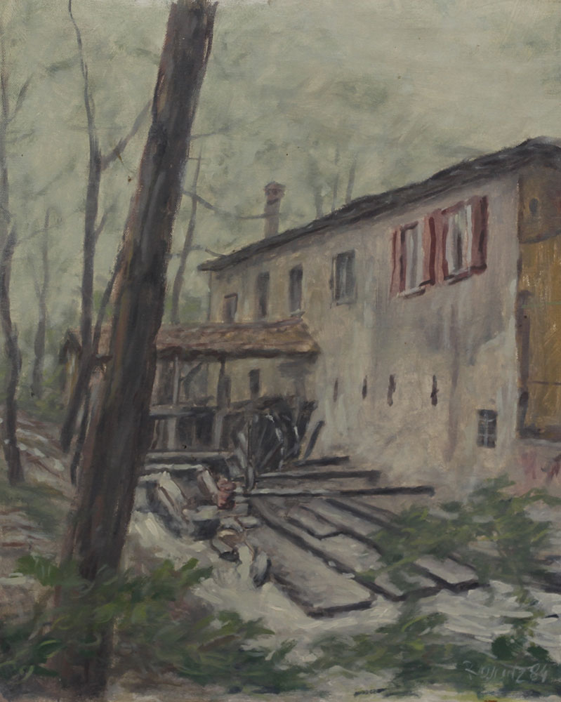 Rossini (artista non identificato) Vecchio Mulino (Cascinette a Canegrate) acrilico su tela, cm. 50x40 firmato e datato in basso a destra, intitolato al retro, timbro "G.A.d.A. Gruppo Amici dell'Arte" al retro senza cornice