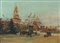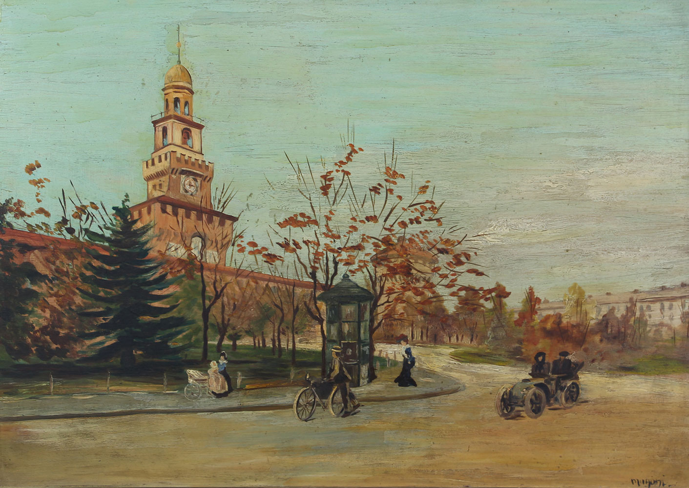 Anonimo Scena urbana olio su masonite, cm. 50x70 firma non decifrata in basso a destra