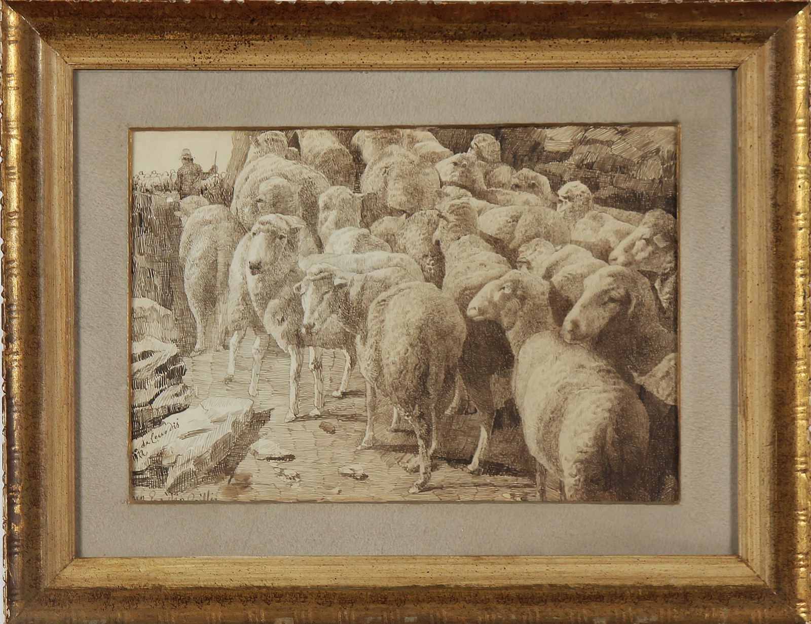 ANONIMO Pecore. China su carta. Cm 32,00 x 22,00. Firmato e datato 1922 in basso a sinistra. Cornice presente