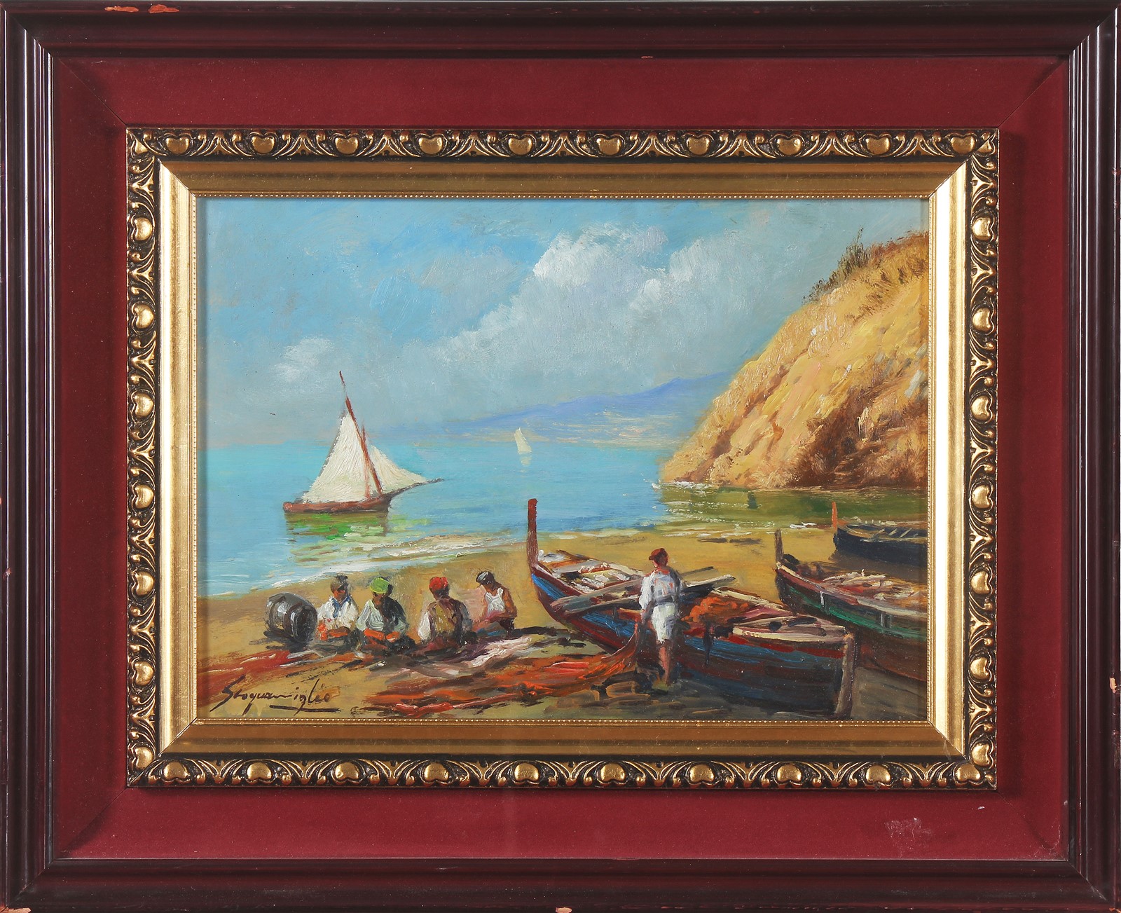 SCOGNAMIGLIO GIUSEPPE (1901 - 1985) Golfo con pescatori. Olio su compensato. Cm 33,00 x 25,00. Firma in basso a destra. . Cornice presente