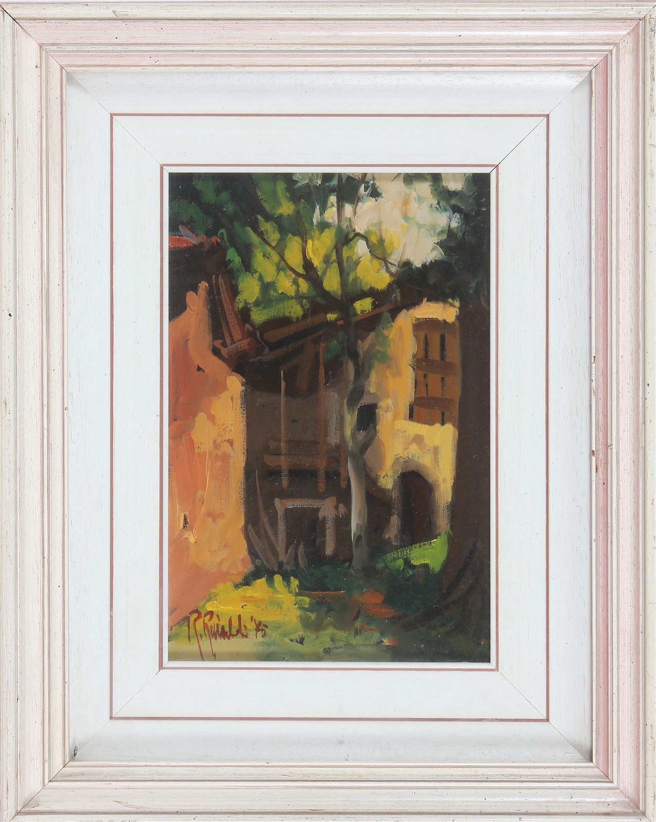 RINALDI RICCARDO (n. 1947) Cascina. 1975. Olio su tavola. Cm 30,00 x 20,00. Firma e anno in basso a sinistra. Cornice presente